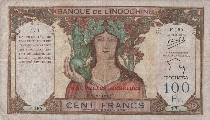 Banque de l'Indochine - 100 francs succursale de Nouméa, surchargé Nouvelles Hébrides