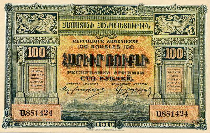 billet de 100 roubles, partiellement en français, imprimé en Angleterre