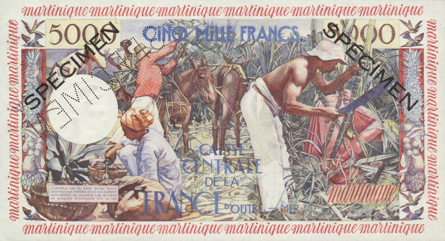 SPECIMEN du 5000 F Caisse Centrale de la France d'Outre-mer type 1955 "antillaise" pour la MARTINIQUE - verso